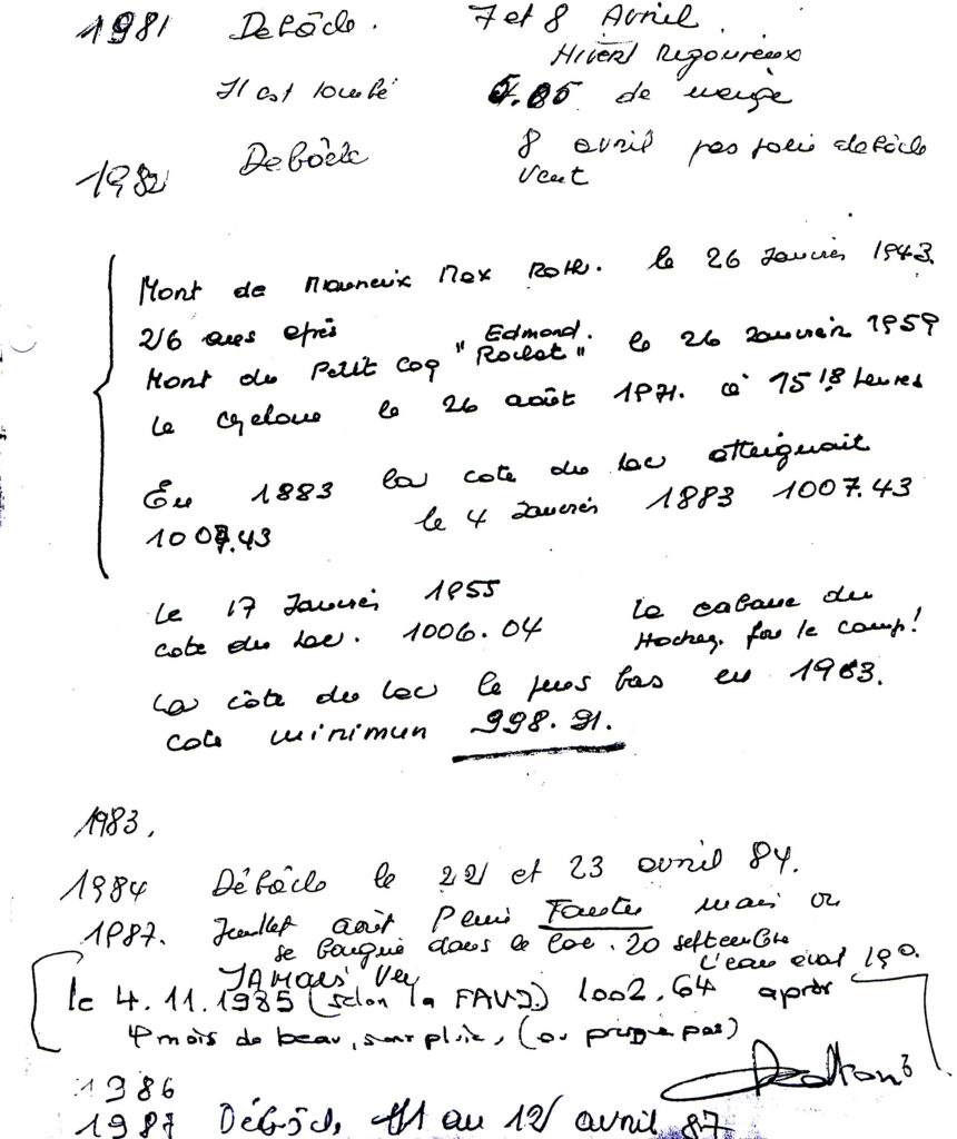 Quand j’étais gosse, j’habitais la vieille maison située à la Pointe, vers chez Grosjean. Très souvent, j’allais sur cette pointe héler le pilote M. Bally, qui me faisait signe en passant. Il était vêtu d’un uniforme bleu avec boutons d’or et portait naturellement la casquette. Il était accompagné d’un contrôleur vendeur de billets, lui aussi en uniforme, qui faisait le service d’amarrage. Le dernier chauffeur, Marius Hering, qui fut ensuite coiffeur au Sentier, est mort au printemps 1978. Nous allions pêcher la perchette quand il y en avait encore, sur le débarcadère situé dans le golfe de vers chez Grosjean, débarcadère qui était pratiquement inutile, car on se contenta d’un seul débarcadère situé sous le temple. Ces débarcadères construits entièrement en bois, sur pilotis, devaient être démontés en temps utile, car la glace aurait tout écrasé, et reconstruits au printemps. Le coût de ces opérations a fait l’objet de contestations entre les villages et la commune, chacune de ces administrations voulait se décharger sur l’autre. Je crois qu’en ce qui concerne les Bioux, les jeunes du village y contribuaient bénévolement. L’un d’entre eux, le jeune Reymond, s’est même noyé en faisant ce travail. Ce devait être aux environs de 1890. A cette époque, on ne parlait pas de responsabilité civile, et financièrement l’affaire fut vite classée. Lors de ses soirées, la Société de Gymnastique, fondée en 1907, était autorisée à se servir des planches du débarcadère pour monter une scène surélevée dans la remise qui tenait alors lieu de grande salle. J’ai pris part à ce travail.