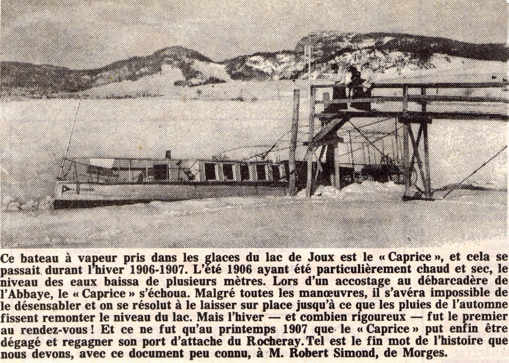 Autrefois, avant la construction du chemin de fer Pont-Brassus, un petit bateau à vapeur sillonnait journellement l’onde claire du lac et transportait les voyageurs du Pont au Rocheray. « Caprice » était son nom, et ce nom lui allait à merveille, car il se montrait parfois fort capricieux dans sa navigation. Il lui arrivait de s’ensabler. Un jour que pareil accident lui était advenu, il avait à son bord un vénérable magistrat, décédé depuis longtemps, qui, saisi d’une émotion bien compréhensible, apostropha l’équipage en ces termes : « au nom de la loi désensablez-moi ce bateau ». Du gentil « Caprice » il ne reste que le souvenir et les vestiges chaotiques de la jetée d’accostage[6]