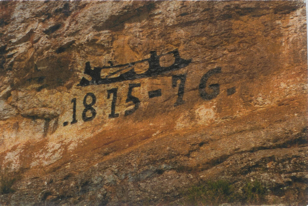 En face de l’Abbaye, de l’autre côté du lac, sur des roches couleur de fer, se découvre la silhouette d’un patin et ces dates : 1875-1876. Cette peinture d’importance, rafraîchie de temps à autre, s’appelle… devinez comment… Le Patin !