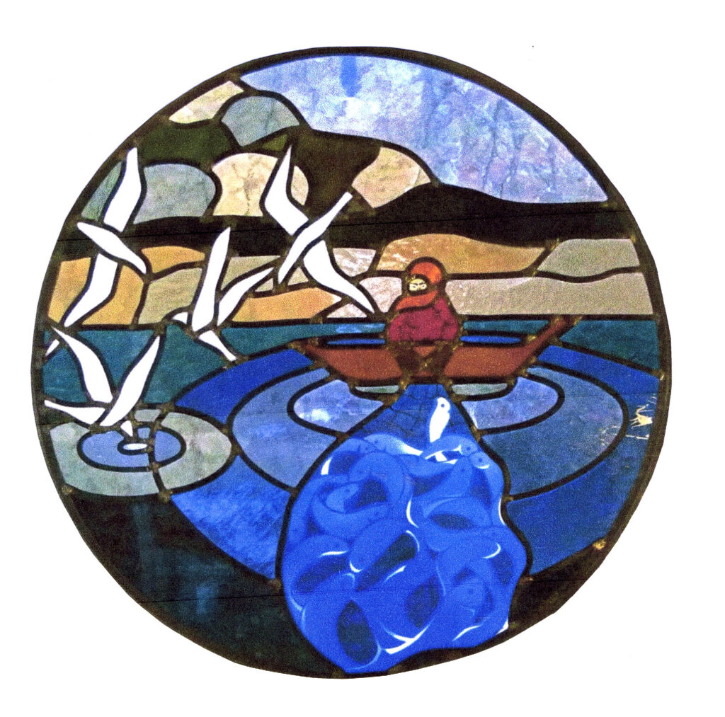 Ce cinquième vitrail d’Anne-Lise Vullioud, vitraillère au Brassus, témoigne de la présence immédiate d’un lac qui pourvoit en partie à vos besoins culinaires. Pour le personnage, homme ou femme, la question reste posée !