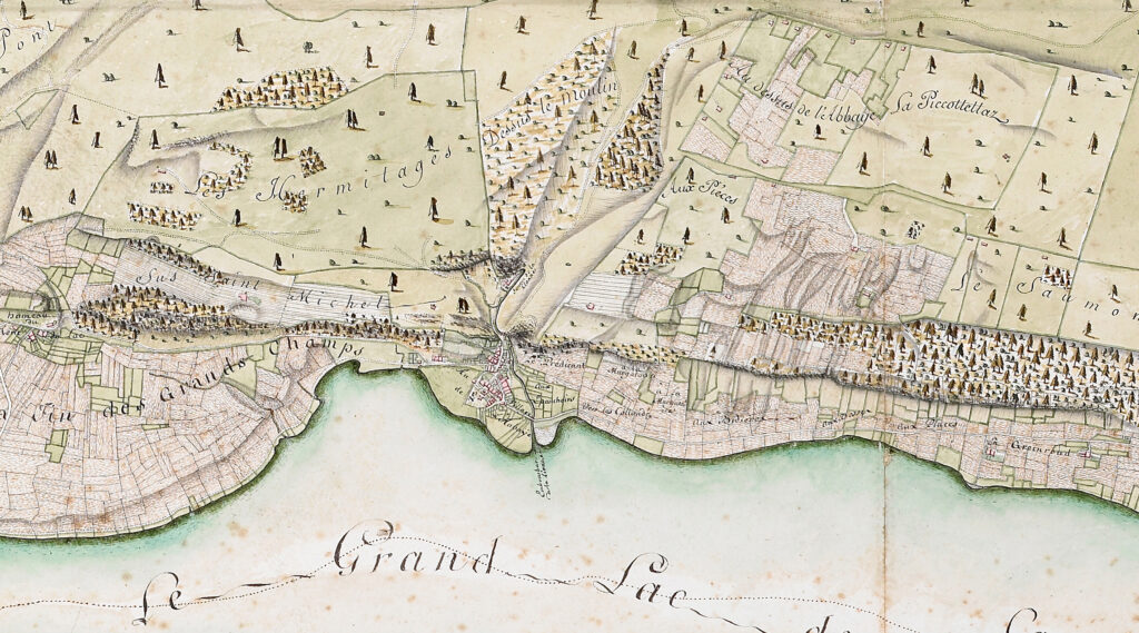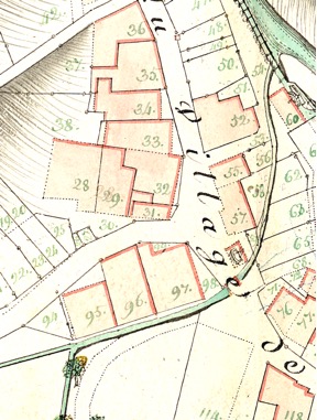Cadastre de 1814. 55. Fromagerie 57. Four et école, avec la grande fontaine couverte juste au-dessous. Le no 60 est la scierie du bas, la moins performante des trois alors en place dans ce quartier supérieur. Toutes les fermes sont encore construites à l’ancienne.
