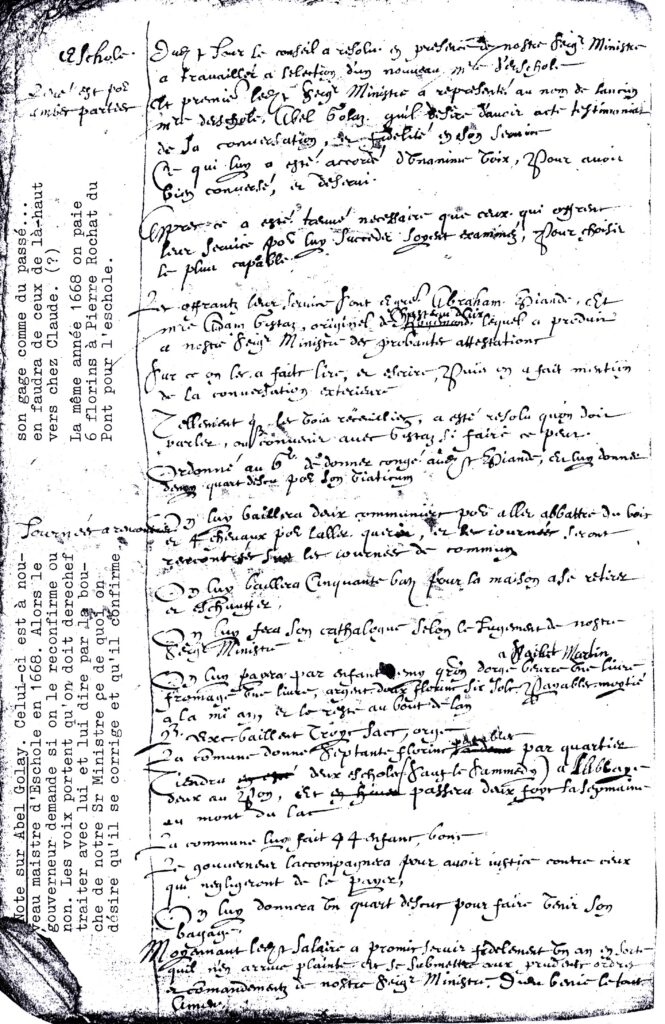 Etablir les fonctions du réent ou de la régente de l’époque, nous entraînerait trop loin. Notons que la religion se trouve toujours au premier plan et que le régent participe à des lectures à l’église. Traitement de 350.- payables par la commune, plus logement, plus jardin et droit de bourgeoisie pour le cas où il ne serait pas lui-même bourgeois.