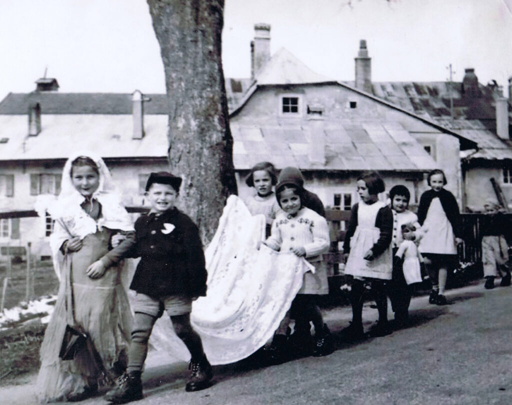 Juste au-dessus, c’était le four, établi en ce lieu après qu’il fut longtemps situé dans l’ancien quartier « monacal » du bas. Il devint par la suite boulangerie, avec le dernier animateur, John Truan. Et puis venait l’école. Bâtiment réservé à cet usage jusqu’en 1830 où un grand et beau collège, indépendant des autres bâtiments cette fois-ci, fut construit à quelque distance de là. On trouvait encore, tout cela appondu, la laiterie ou fromagerie du village, construite en 1811. On devait y fromager jusqu’en 1955, avec pour dernier laitier Alfred Besson, en place depuis au moins 1934.